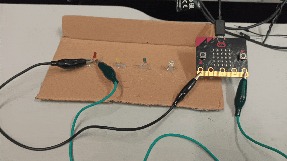 Test your code. The led lights should turn on when buttons are pressed and turned off when you shake the microbit. This is due to the 3v supply to the pins from the microbit supplied as a digital write (either on or off).