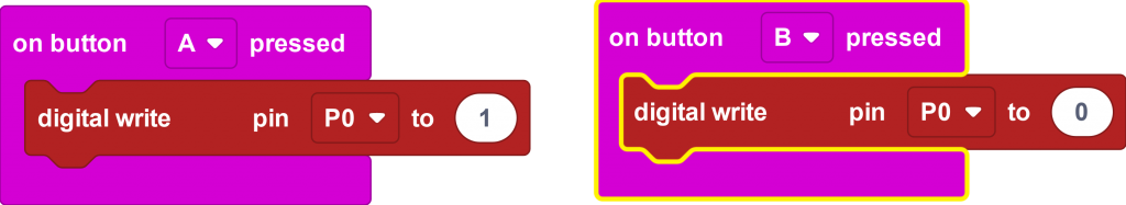 Go to makecode.microbit.org and code up the button presses to turn on the pins as a digitalWrite. I’ve added button b pressed to clear the lights (you could do any event such as shake).